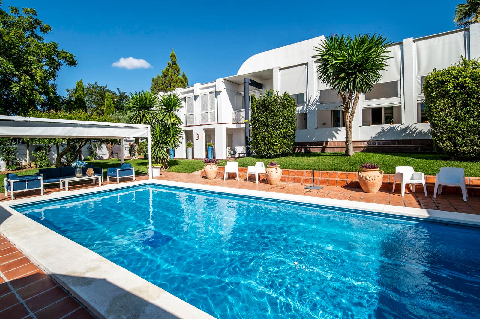Privé zwembad (9,5 x 5 meter), tuin met gras en olijfbomen, buitenkeuken met zitje, bar, goosteen en koelkast. Diverse terrassen, tuinmeubelen, ligbedden, barbecue, 4 parkeerplaatsen.